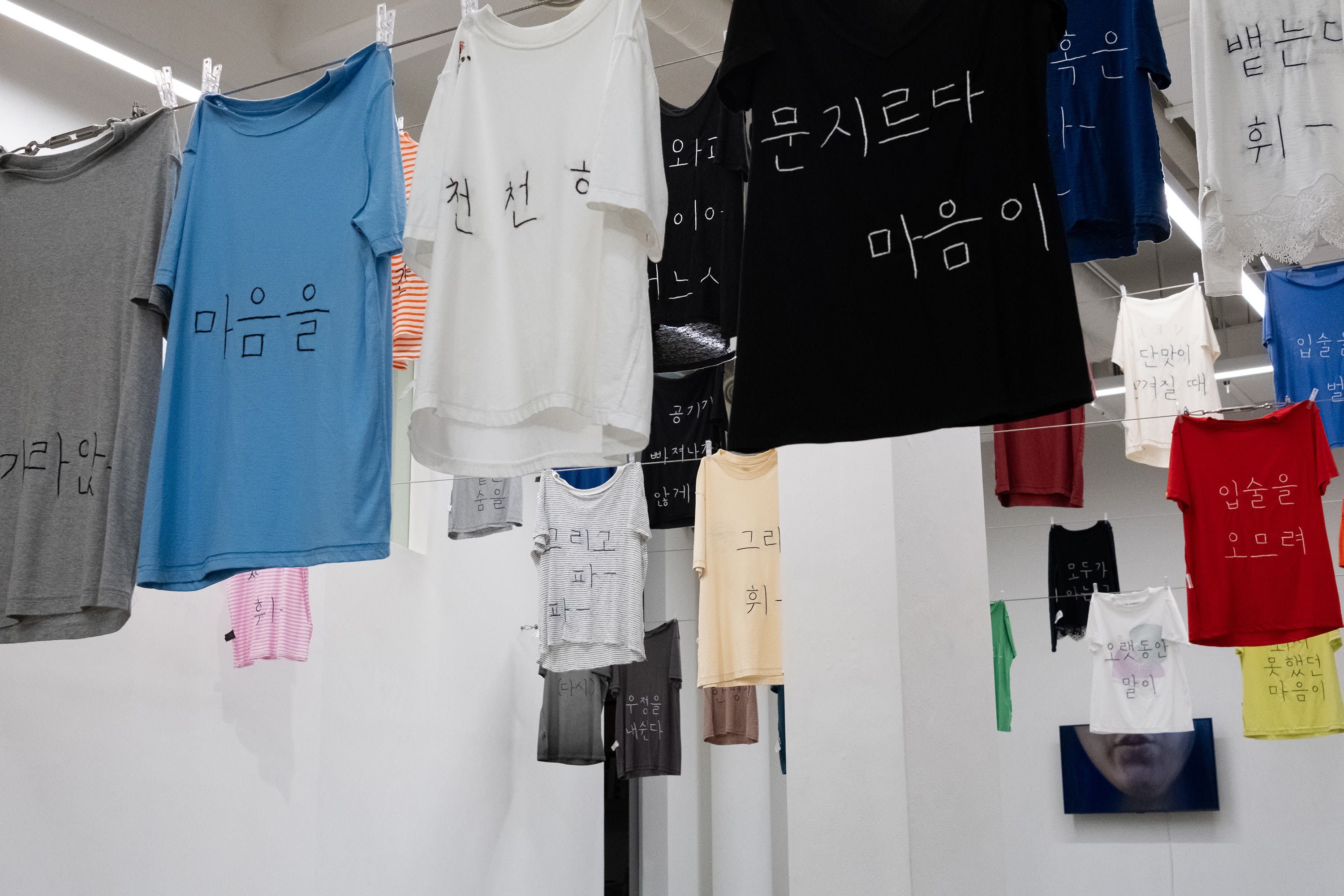Whistlers (2023), which shares the same title as the exhibition, is a video work that Park produced at a WING workshop with the women last year. It shows a performance of serial whistling, as 12 women standing side-by-side take turns inhaling and exhaling each other’s breaths. Sharing breath turns into a poem, and it gets embroidered on t-shirts donated by the artist’s friends in How to Whistle (2024). phwee phwee fweet fweet (2024) is a video work in which two actors read six letters that Park’s friends including actors wrote to their friends, whispering an emotional intimacy that transcends language and logic. This intimacy continues in Mountains (2024), where participants at the 2023 WING workshop depicted what they cherished, held in their hands.