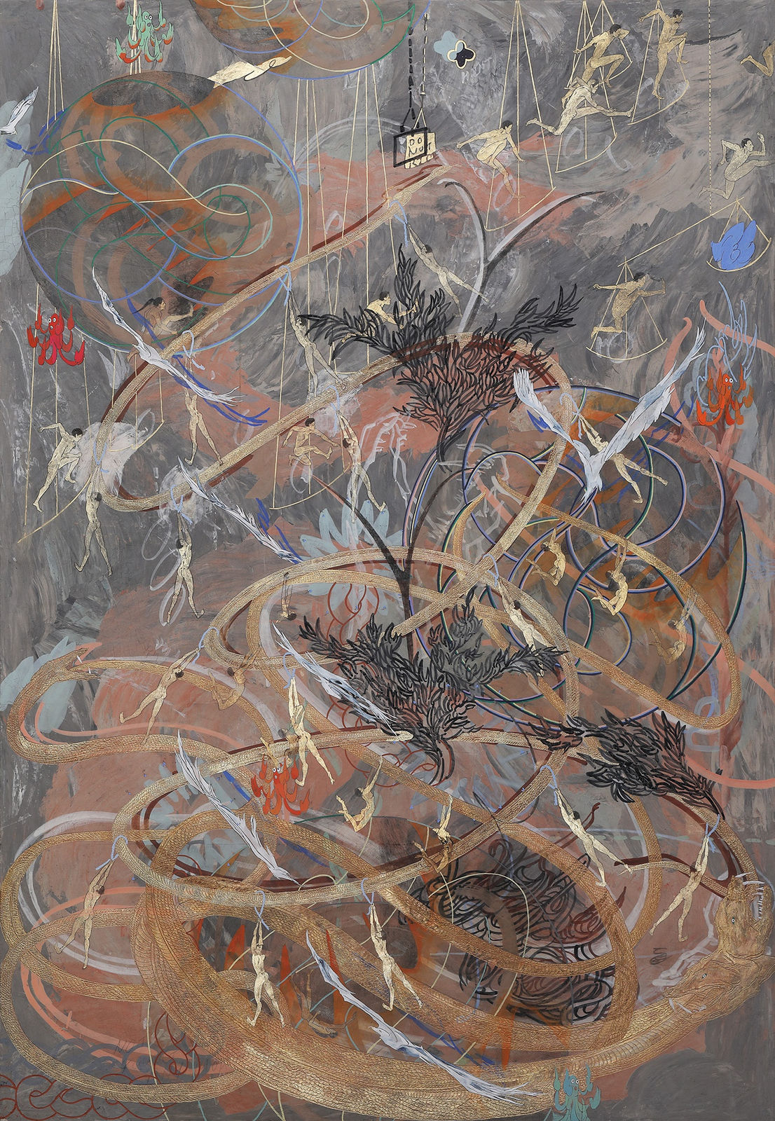 『연금술사의 기둥』은 금이 되려는 '동'들의 움직임을 나타낸다. 쉽게 변하는 동이 금이 되려고 한다는 것에서 연금술적인 순 간이 필요하다. 벽 안에서 반짝이던 그림의 움직임들은 지금 벽 밖으로 탈출하려 한다. 벽이 세워지고, 층층이 쌓이고, 안과 밖을 구획하려는 것이라면 기둥은 무엇에 의지하지 않고 오롯이 혼자서 위아래를 잇고 지탱한다.